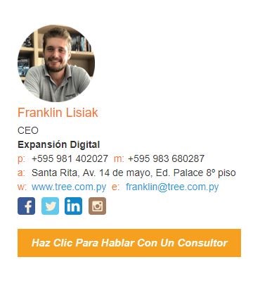 Abajo sigue una firma de correo electrónico diseñada para ayudar a generar demanda de leads cualificados y como consecuencia el aumento en las ventas de tu empresa.
